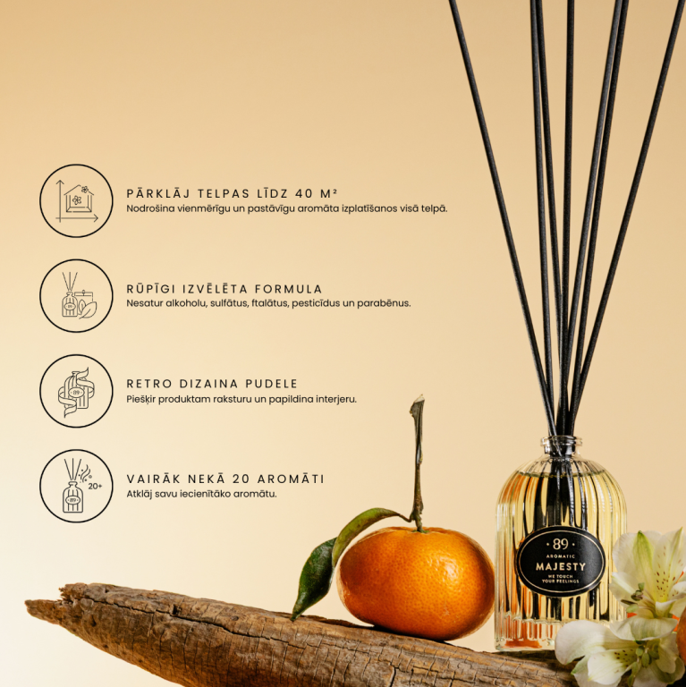 Vienkārši ievietojiet kociņus pudelē un ļaujiet aromātam dabiski izplatīties. Pielāgojiet intensitāti, pievienojot, noņemot vai apgriežot kociņus.